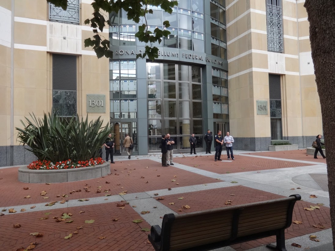 Anti-Israel activists (well, two of them anyway) Noura Khouri and Henry Noor are sitting symbolically in front of a doorway at the Oakland federal building to express their uncontrollable rage over convicted murderer Rasmea Odeh's  pending imprisonment.  Two of their comrades have used U locks to fasten their necks to the building.  They seem vaguely aware of just how ridiculous it look, and they avert their gaze from mine. A handful of other anti-Israel activists are also milling around aimlessly, waving banners and chanting slogans.