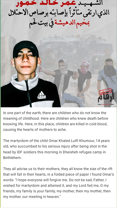 16-year-old Omar Awadin, ( nicknamed on Palestinian channels "al-Shaheed al-Mujahed" - "the Martyred Warrior ( one who engages in Jihad)"